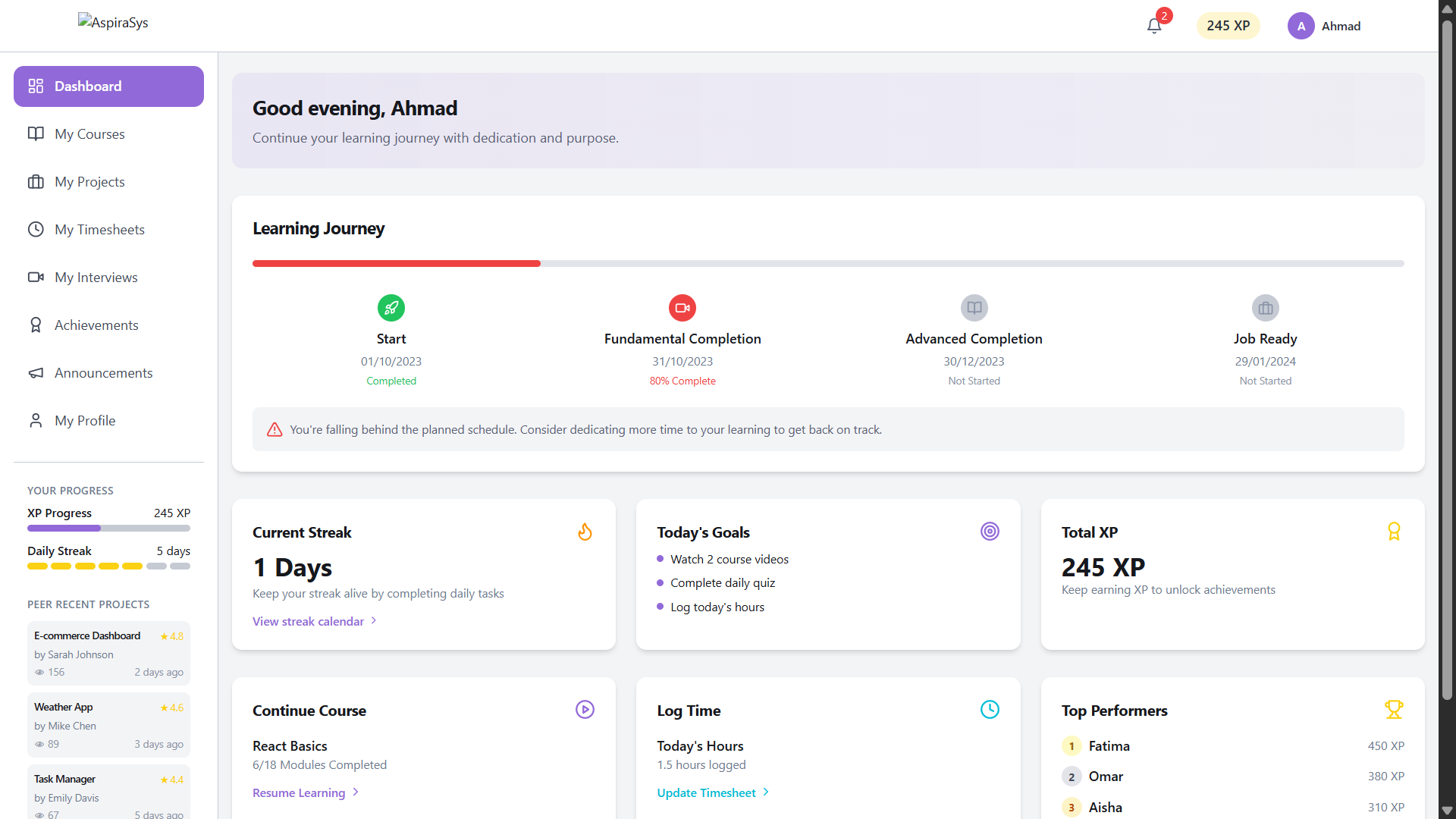 AspiraSys SkillHub is a role-based web application with four roles: Admin, Aspirant, Manager, and Branch Manager, each having dedicated dashboards. It was developed using ReactJs, NodeJs, ExpressJs, and SQL for a scalable and efficient system. I built interactive UIs with ReactJs and developed backend APIs for authentication and task management. I integrated SQL databases for secure data handling across multiple roles. Additionally, I performed Manual Testing to ensure functionality, usability, and a smooth user experience.